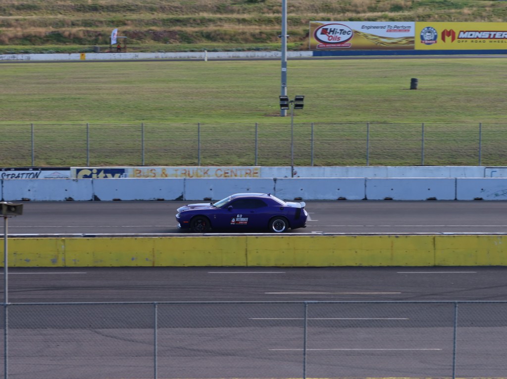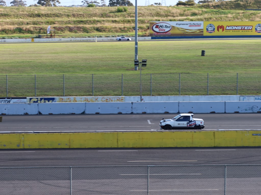 Before the hot laps started, I dashed down to the drag strip end of the track as I had done earlier in the hopes that I could take some good photos, but I was unable to go further than the marshal post because there wasn’t any fencing. That ruined things for me but I understand the safety risk, so I sat behind the fence as the first few cars came by. I tried moving right up to the fence and poking my camera through a hole in the wires, but I couldn’t get close enough. After this little setback, I quickly considered my options and decided to scale the spectator mound overlooking the circuit. I thought beauty, this is a top spot for some photos, but then I discovered another problem – my camera’s zoom wasn’t good enough. The resulting pictures looked like this: